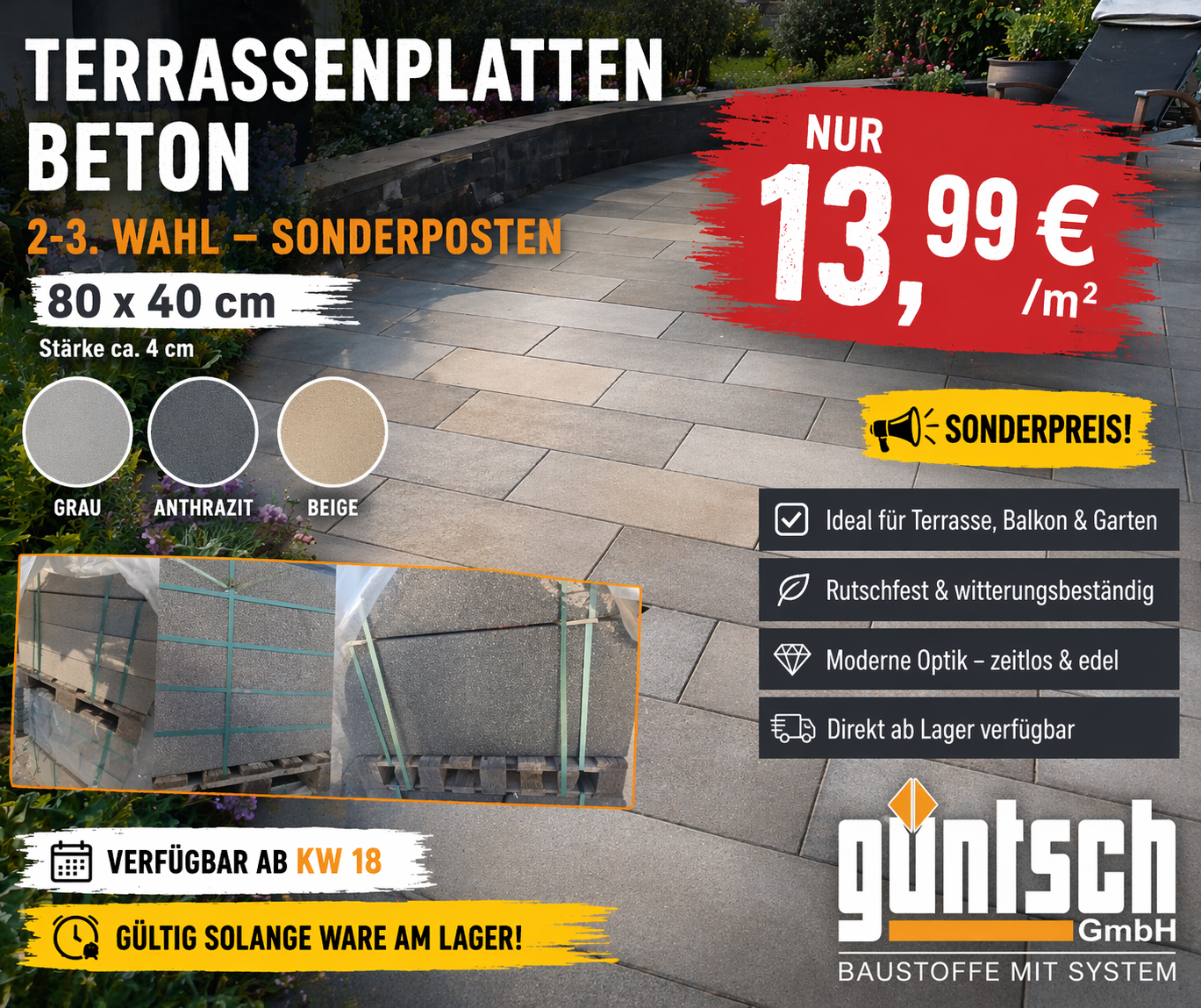 Die Güntsch Baustoffe GmbH ist Ihr zuverlässiger Partner, wenn es um hochwertige Baustoffe zu marktfähigen Preisen geht. Egal ob für Dach, Fassade, Ausbau, Fliesenzubehör, Terrasse und Balkon oder den Roh- und Tiefbau – bei uns finden Sie die passenden Materialien sowohl für den gewerblichen als auch für den privaten Bereich.